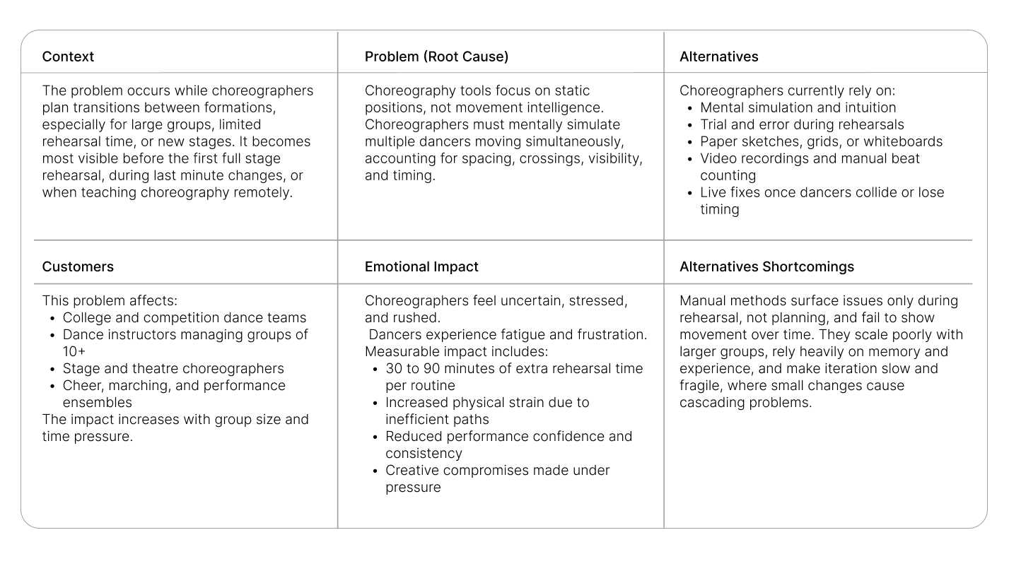 Choreographers were spending energy solving spatial math instead of shaping emotion. The opportunity wasn’t to add features. It was to remove friction.