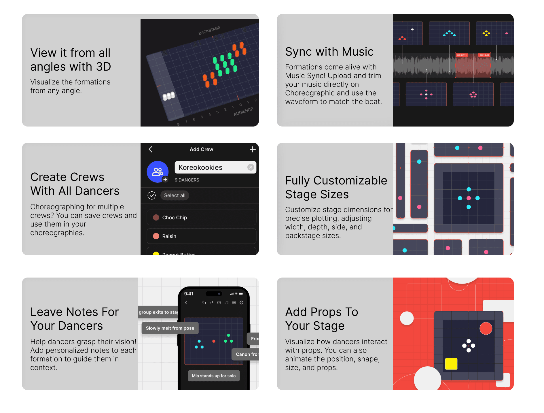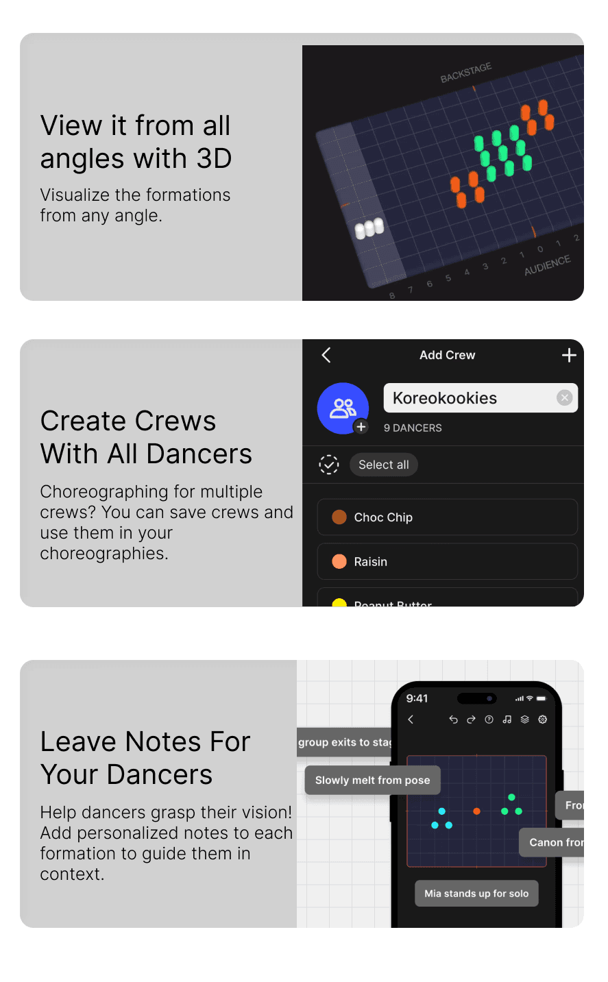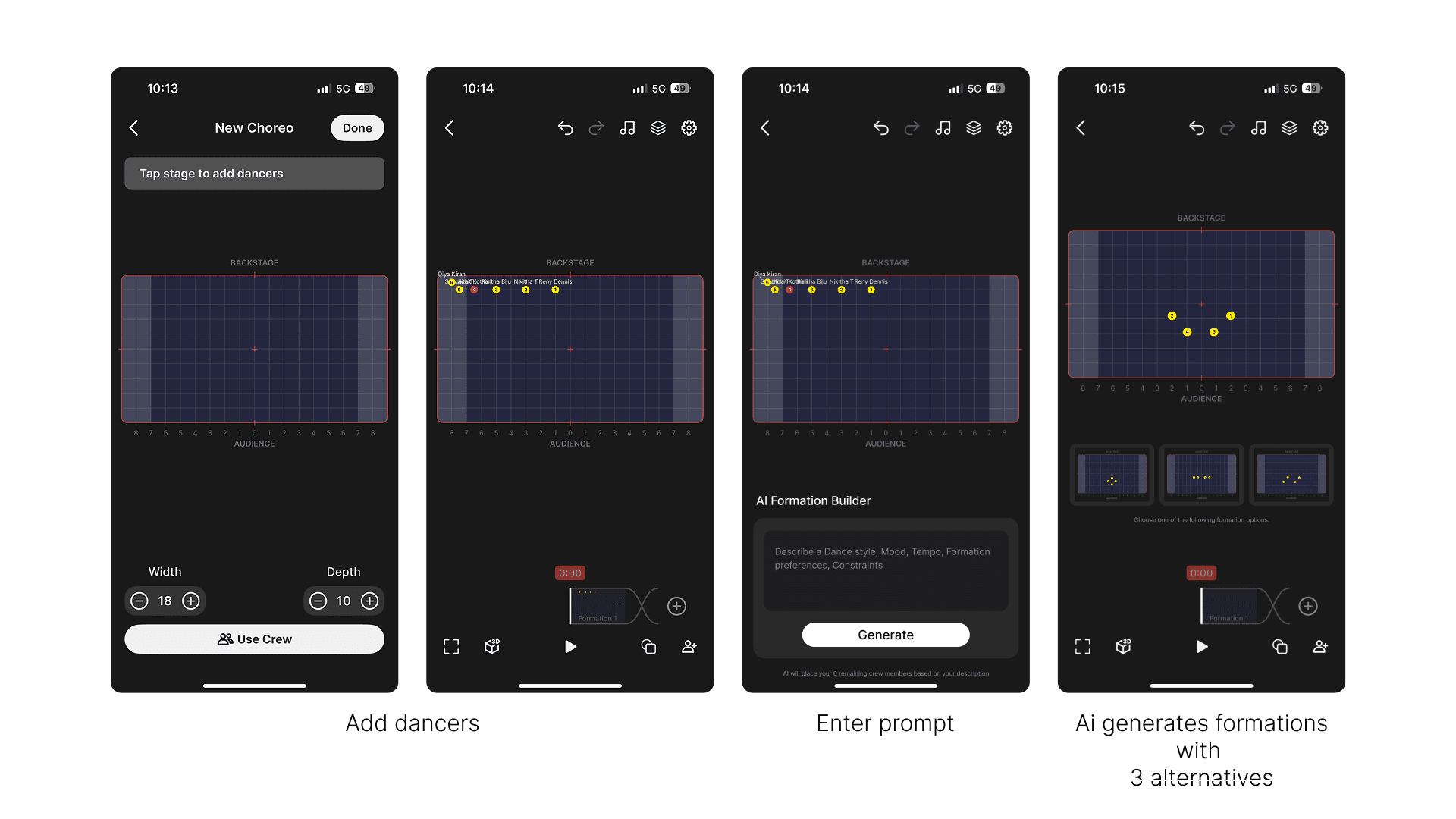 The next phase of Choreographic evolves from a planning tool into an intelligent creative partner. AI will learn individual choreographers’ styles, optimize formations for visibility and symmetry in real time, and simulate full routines before dancers ever step on stage. With predictive spacing, adaptive timing, and generative pattern exploration, the platform will move beyond execution into inspiration accelerating ideation while preserving artistic control.