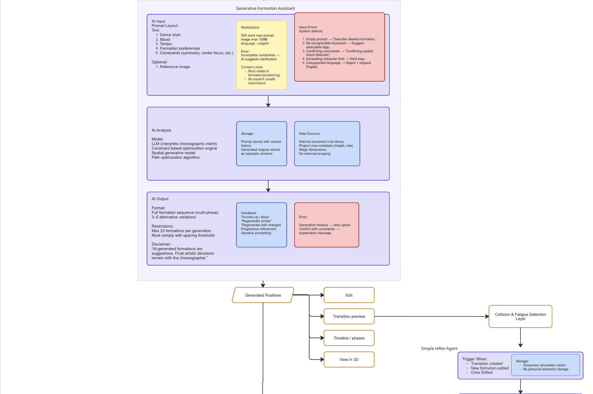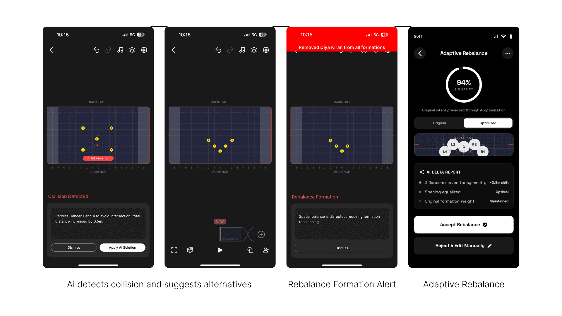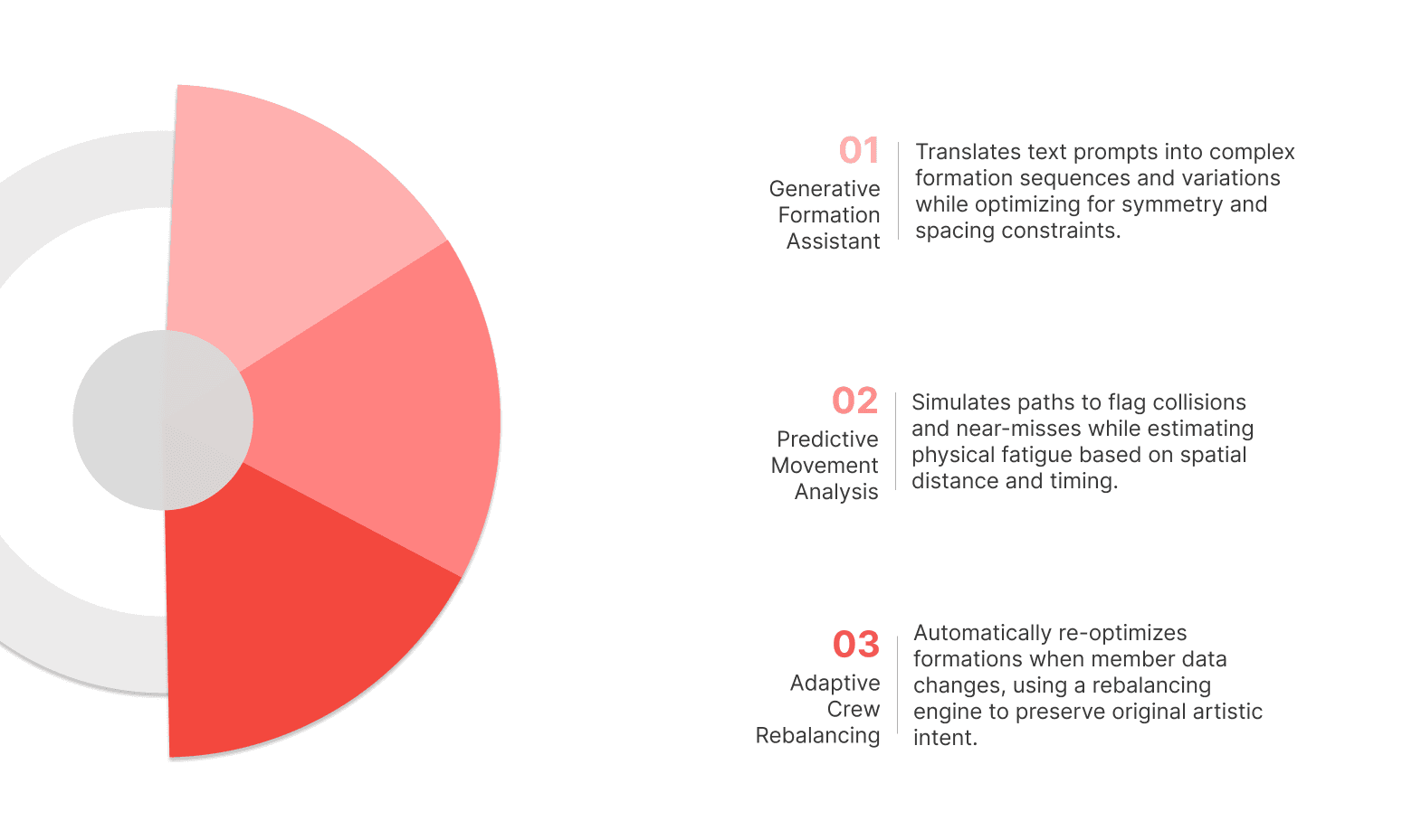 Reimagining choreography planning with AI that turns complex spatial coordination into instant, collision-free formations reducing rehearsal friction while preserving full creative control.