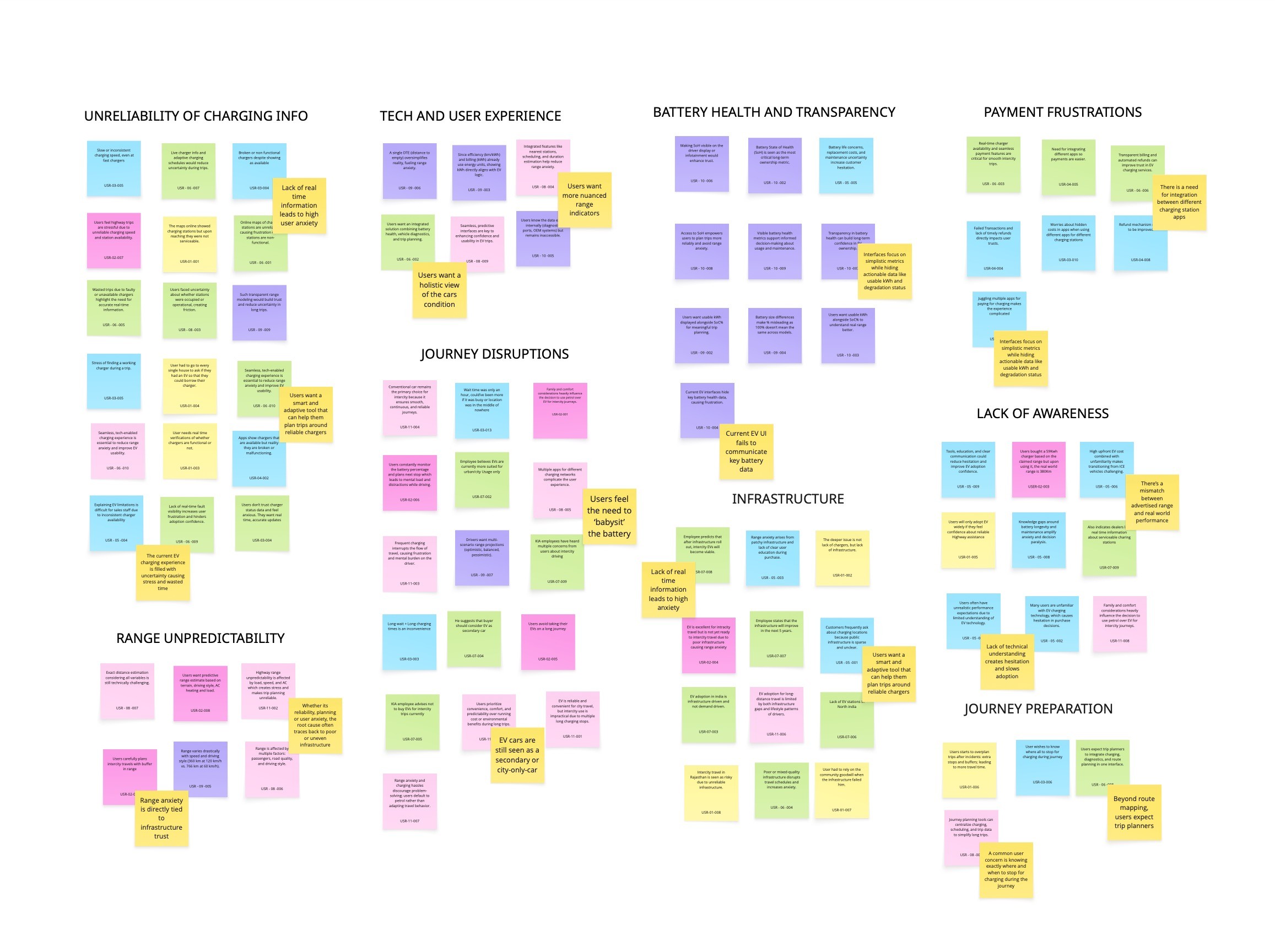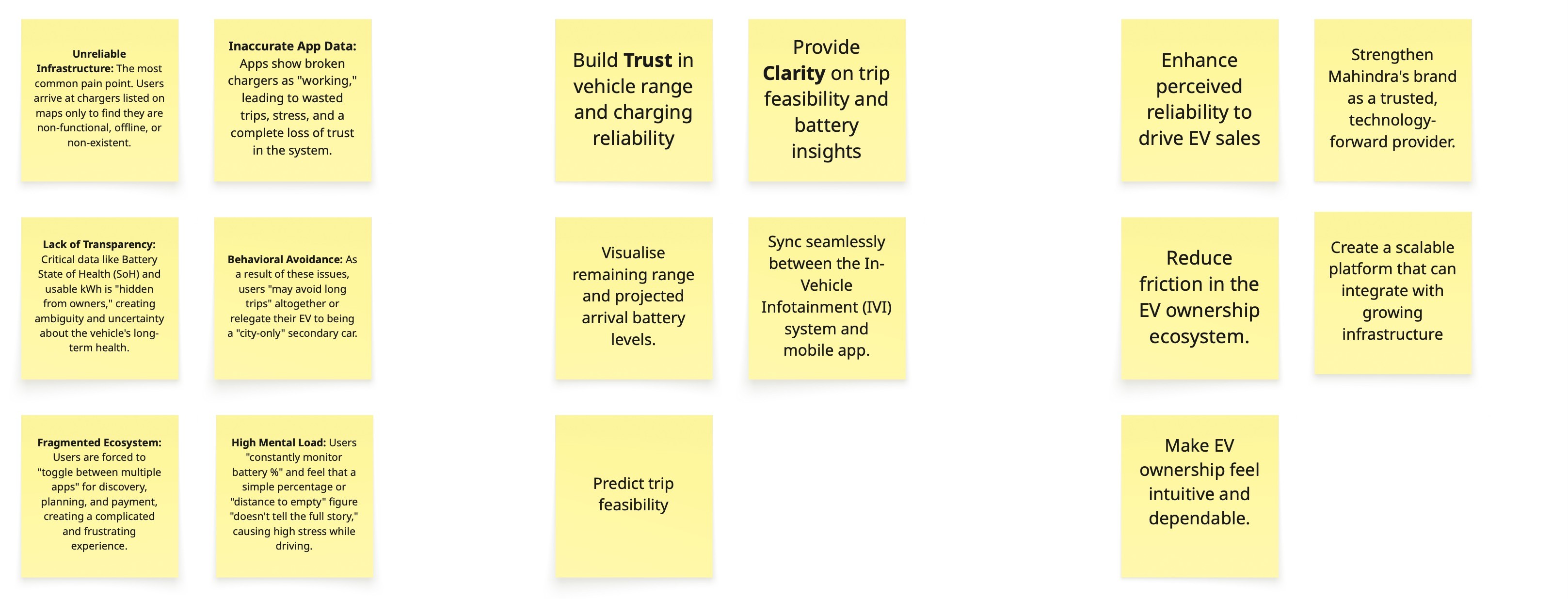 Using journey mapping, service blueprints, and affinity mapping, we translated user problems into clear system opportunities. We defined core requirements such as real-time range prediction, trip feasibility analysis, smart charging recommendations, and continuous reassurance touchpoints.