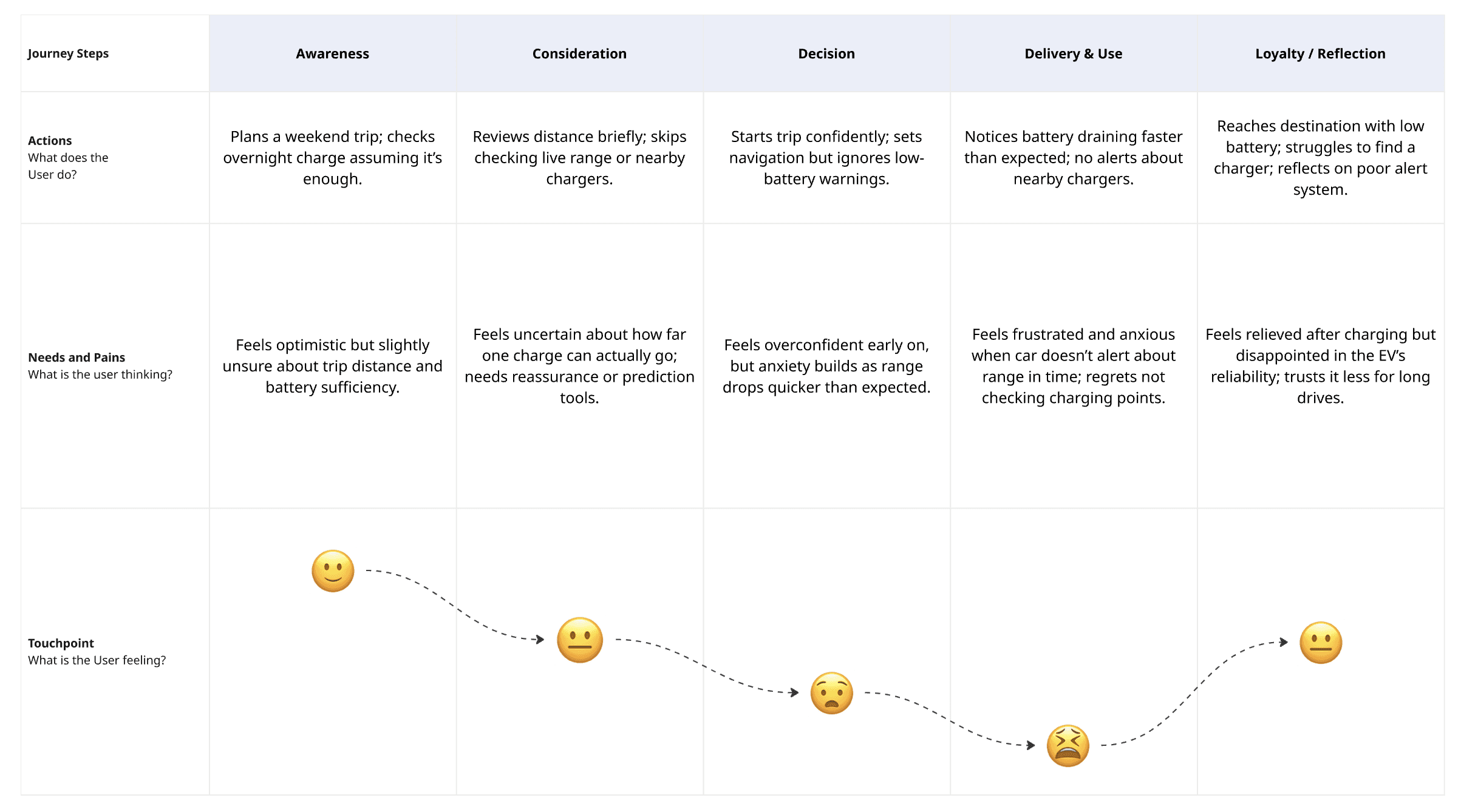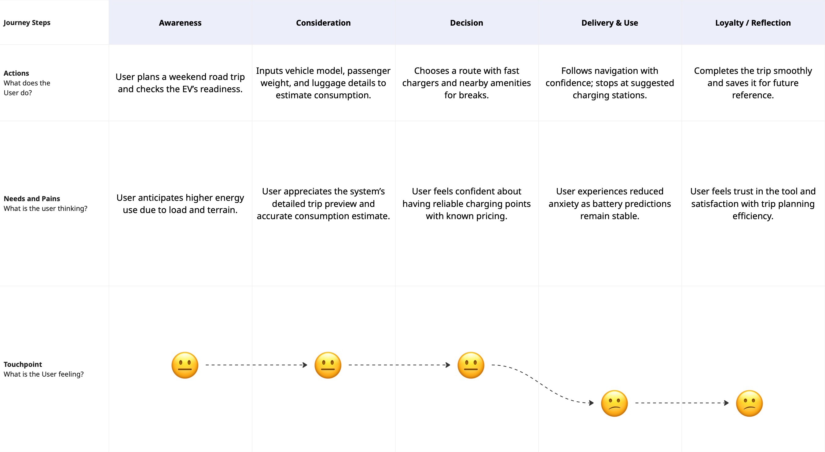 This journey map illustrates how predictive trip planning and real-time charging intelligence reduce range anxiety and build trust throughout the EV travel experience.