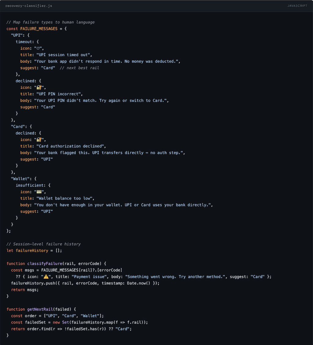 This is the brain. It maps rail + error code to a human-readable explanation. In production, the error code comes from your payment gateway response. In the prototype, failure is simulated with probability weights.