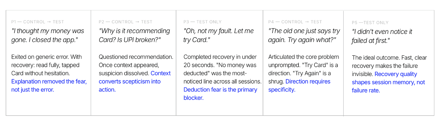 Articulated the core problem unprompted. "Try Card" is a direction. "Try Again" is a shrug. Direction requires specificity.