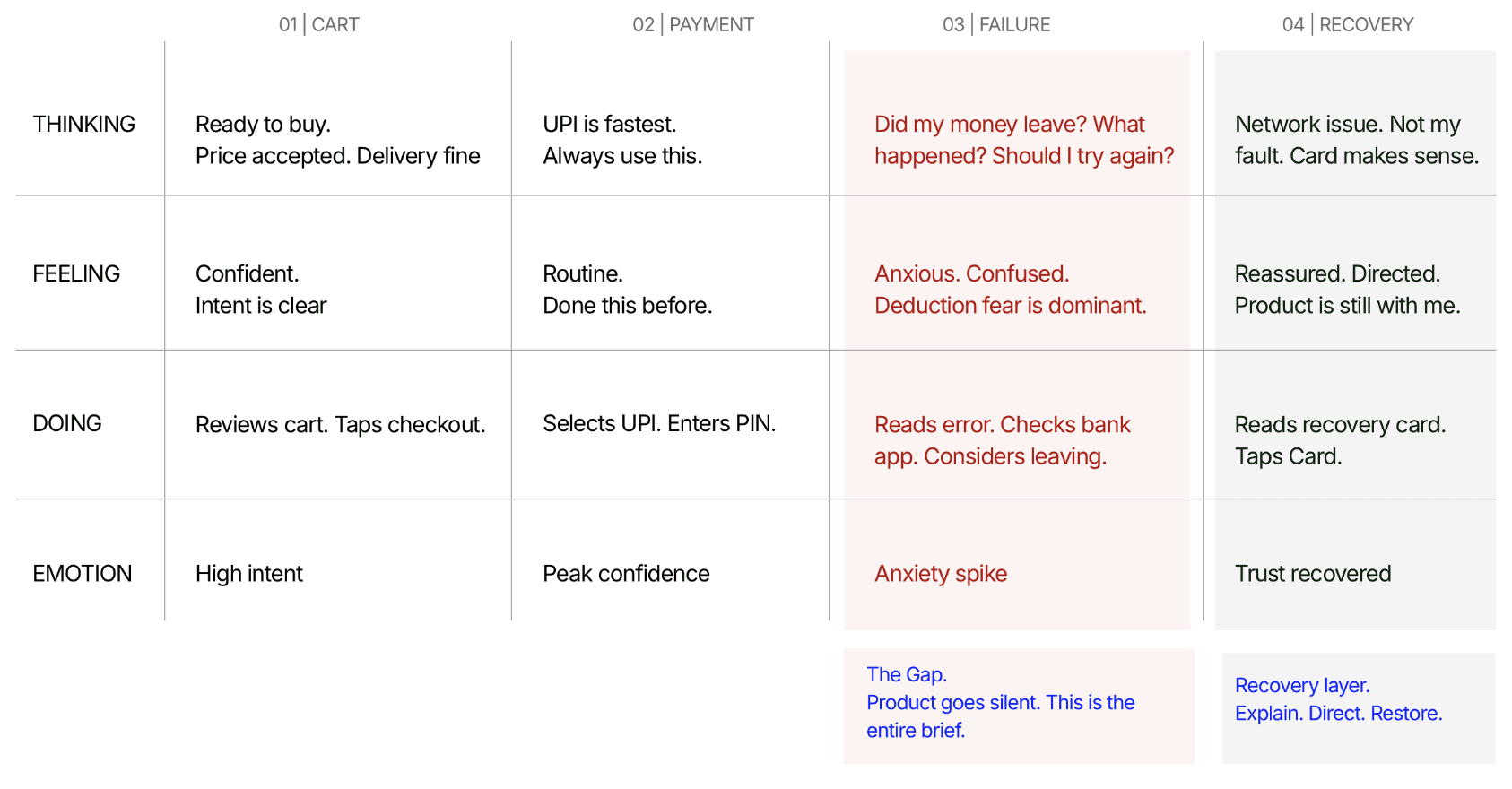 This project explores how payment systems can guide users through failure with clarity, reassurance, and adaptive suggestions reducing abandonment and restoring confidence.