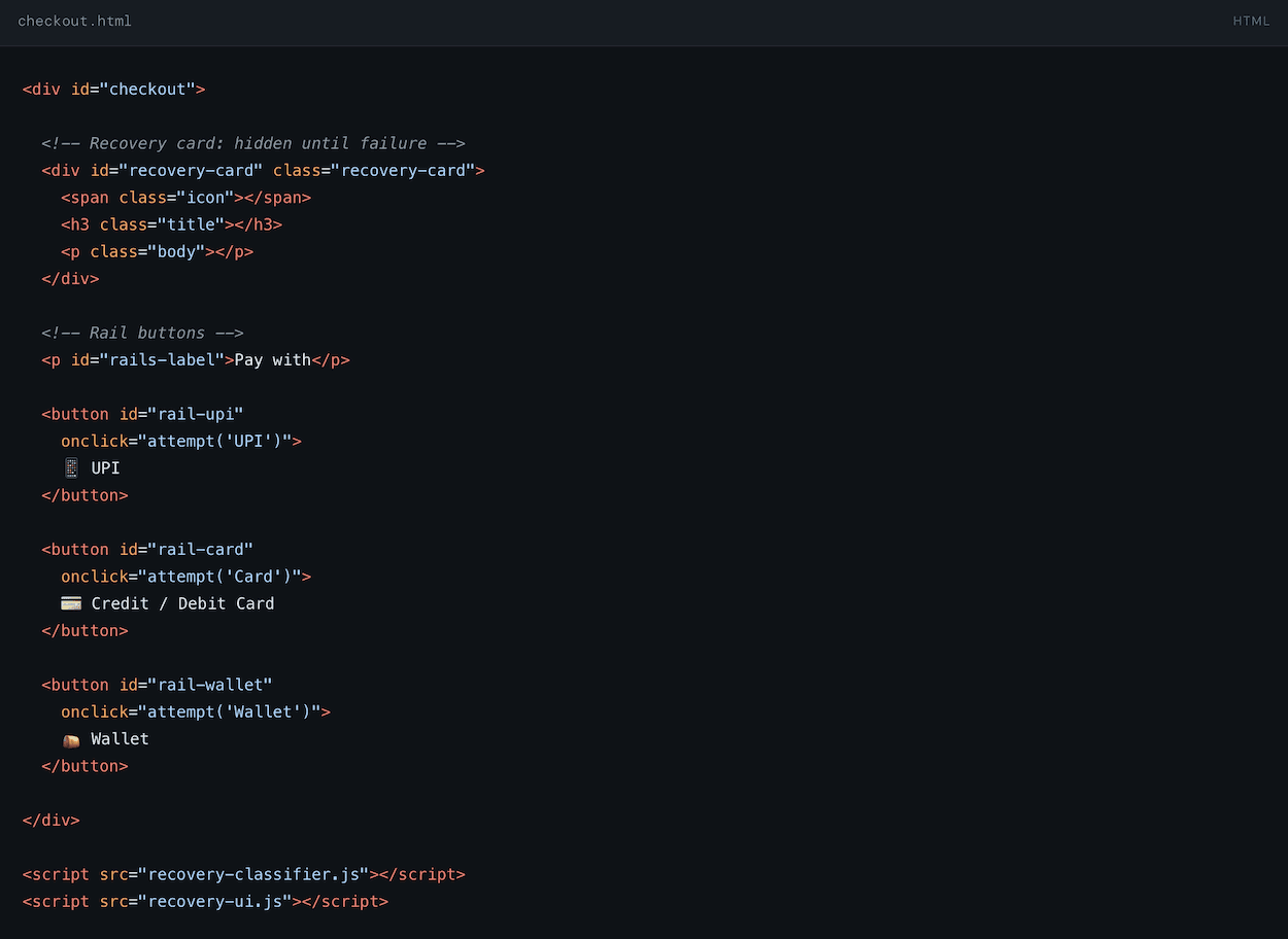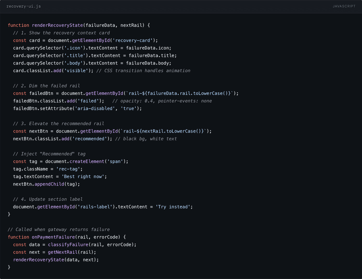 This function takes the classified failure object and updates the DOM. It shows the recovery card, dims the failed rail, and promotes the next best option to the top with a "Recommended" tag. No page reload required.